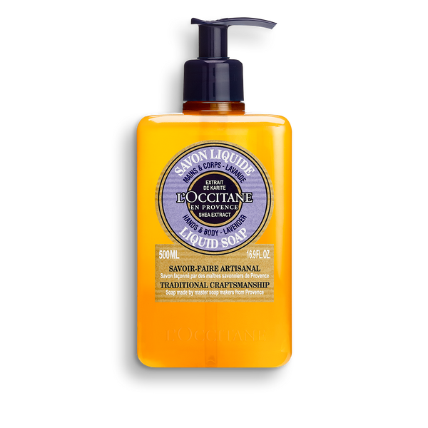 Formulated with a vegetable-origin foaming base and enriched with softening shea extract, this liquid soap cleanses hands and body, leaving them soft and lightly fragranced with lavender.